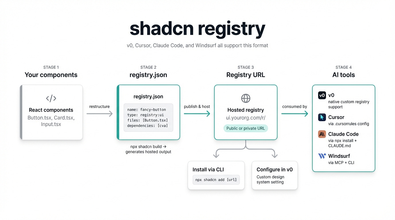 You restructure your components into shadcn’s registry.json format so they install via npx shadcn add @namespace/component. This lets you easily import individual components as needed for prototyping.