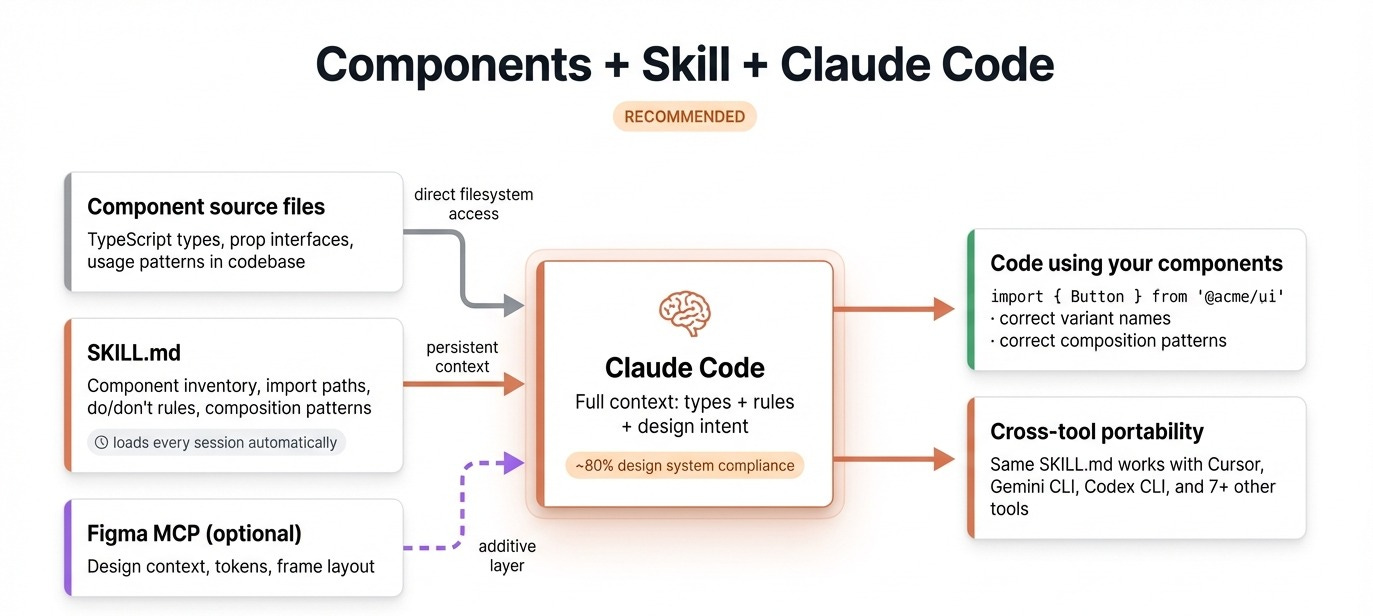 Your component library lives in the repo directly. You create a SKILL.md that documents what components you have and usage rules. Claude Code reads both the skill and the actual source files, which gives the AI a full understanding of how to use the components.