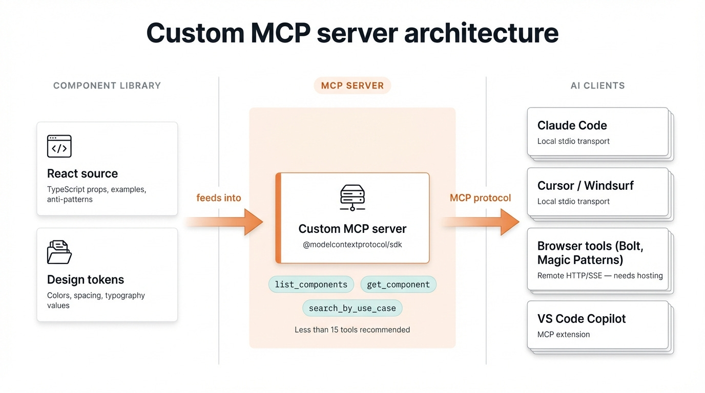 You build a custom MCP server that exposes your component library’s metadata as structured tools. Tools like list_components, get_component_props, get_component_source give Claude Code or Cursor on-demand access to your components, usage examples, and anti-patterns.