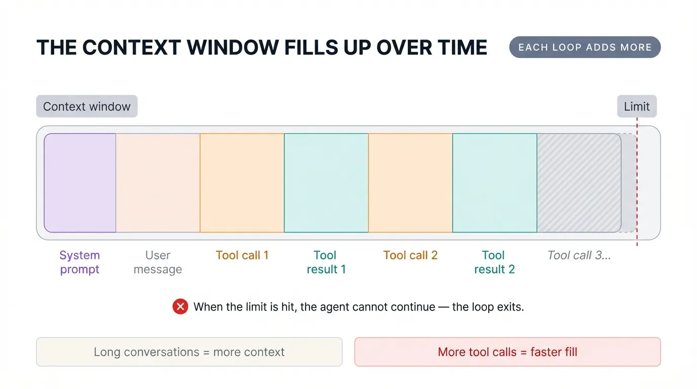 The context window is the maximum amount of text you can send to the LLM in a single call. A 250k token context window works out to roughly 1 million characters of text, which sounds like a lot, but each tool call adds to the history you carry forward on every subsequent call. A long agent session fills the context faster than you’d expect.