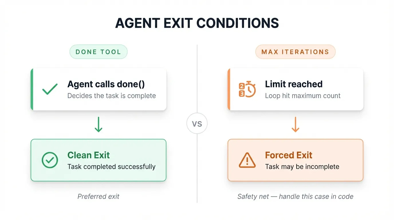 Most production agents use both: the done tool as the primary exit, max iterations as the fallback.