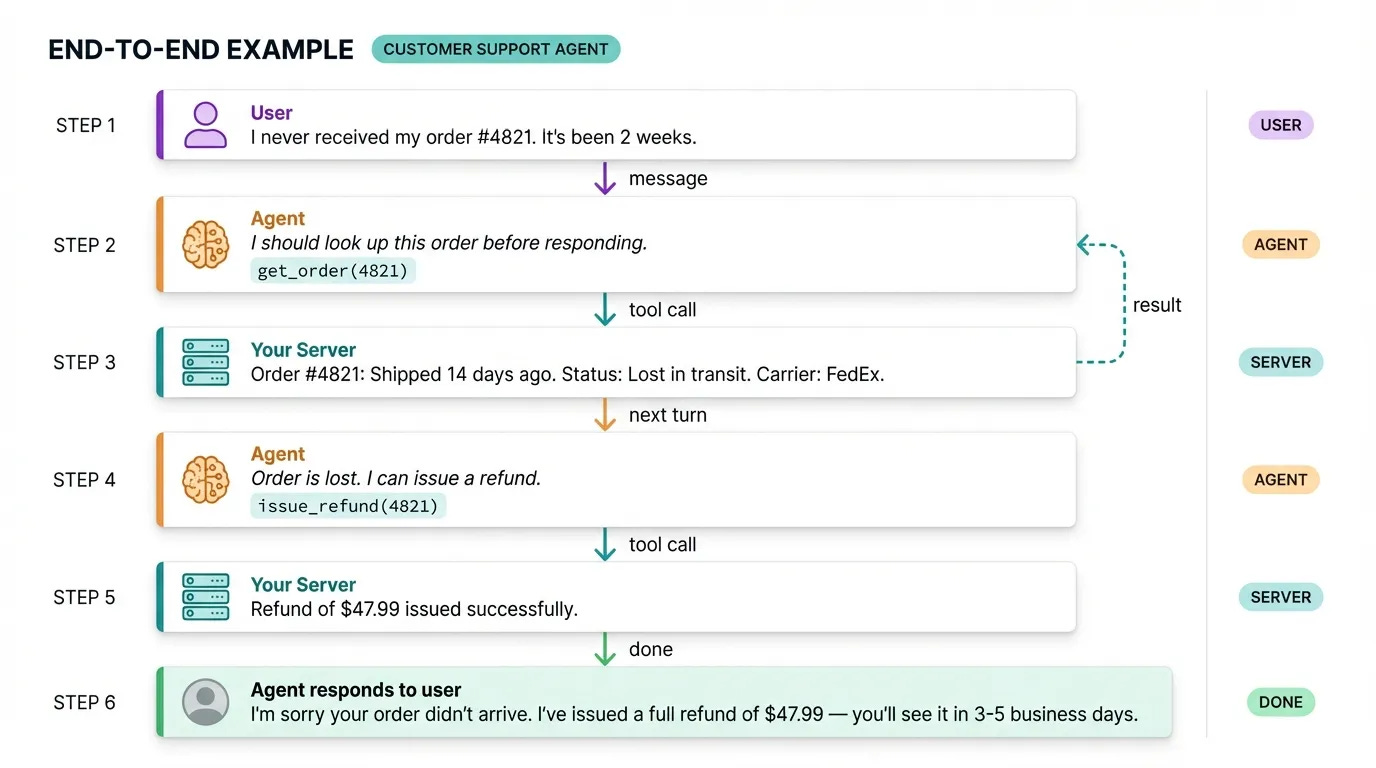 To make this concrete, let’s trace a full example. A user says their order never arrived. The agent looks up the order, finds it’s lost in transit, issues a refund, and tells the user. That’s two tool calls and a final response, all handled without a human.