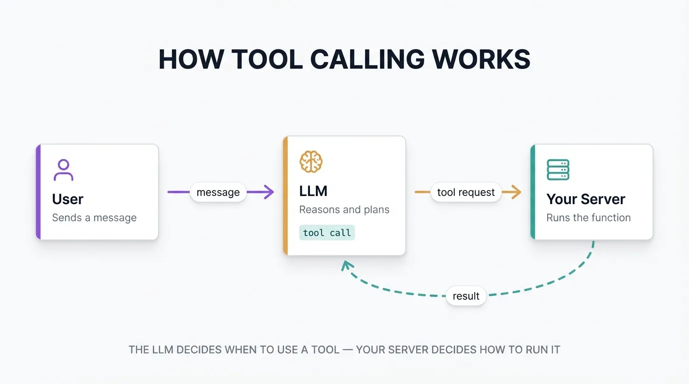 When a user sends a message, your server calls the LLM with the full conversation history. The model reads everything and decides what to do.