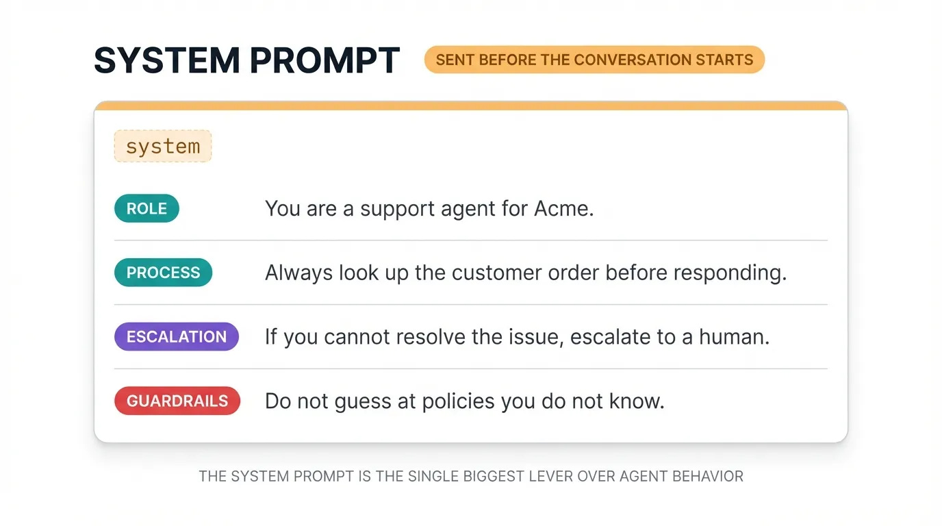 The system prompt is the single biggest lever you have over agent behavior. A well-written prompt prevents most of the edge cases you’d otherwise spend days debugging.