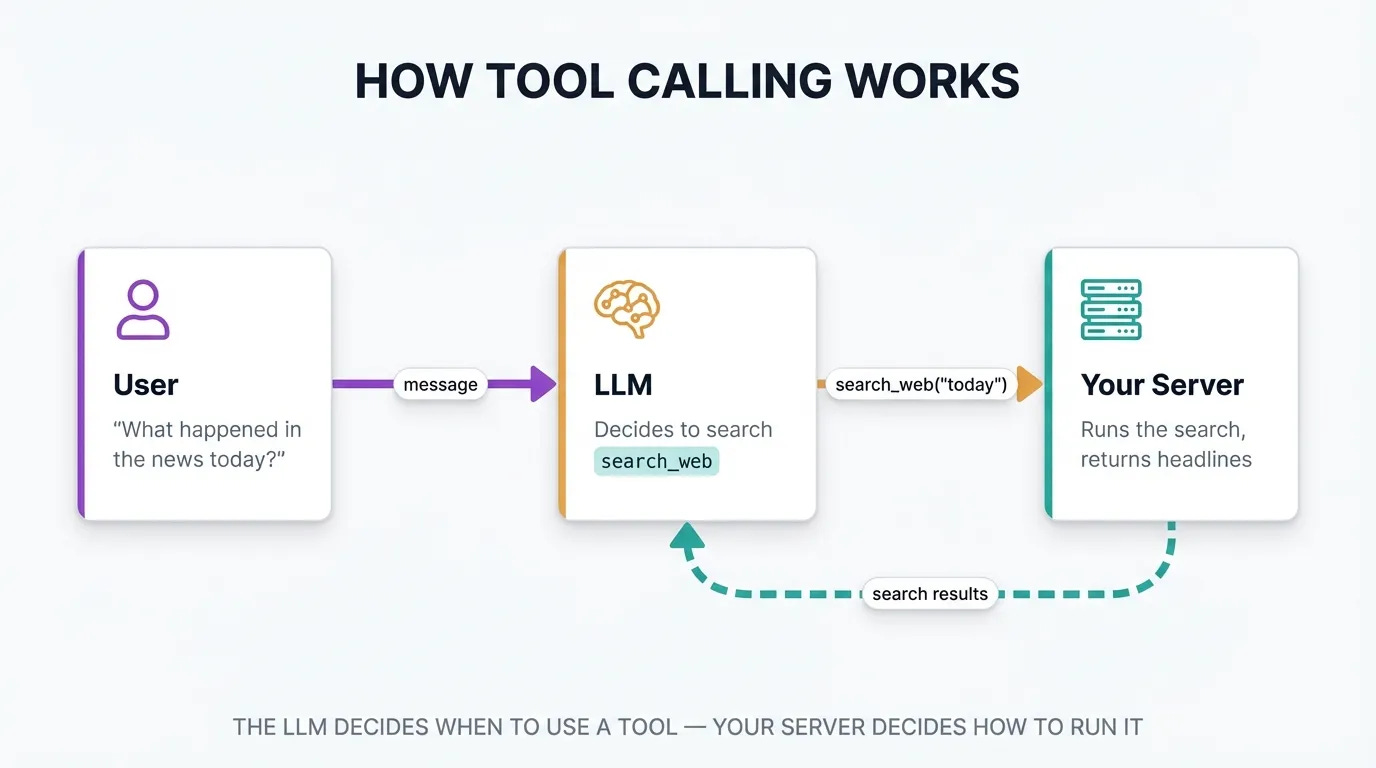 Each tool is a function your server exposes. The LLM requests it by name with whatever arguments it needs. Your server runs the function and returns the result.