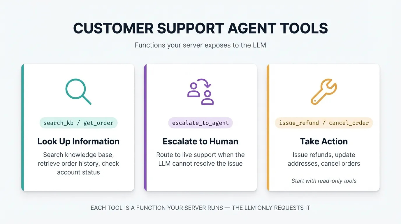 The tools you provide define what the agent can actually do. For a customer support agent, three categories make sense:
