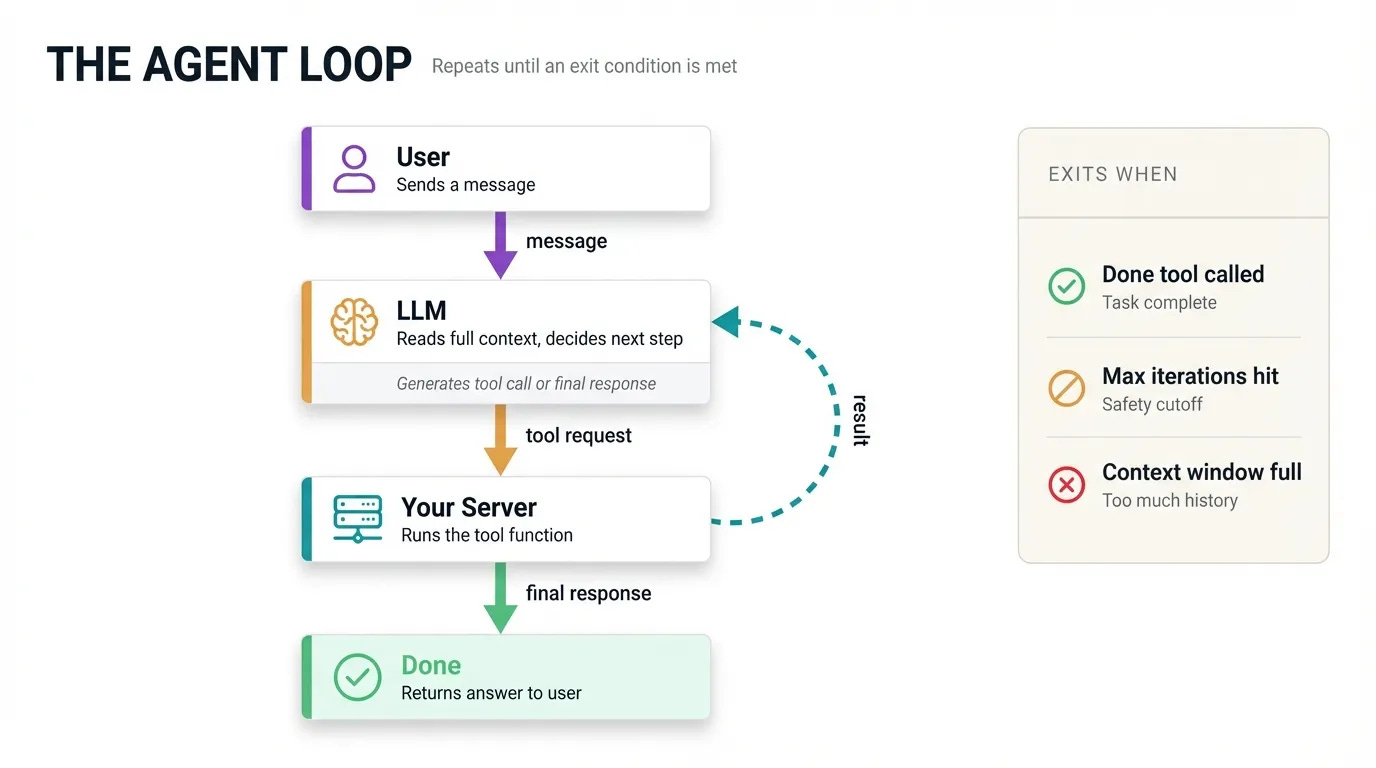 You’ll learn what a tool is, how the LLM and your server pass information back and forth, how the agent decides when it’s done, and how to assemble all of it into a working loop.