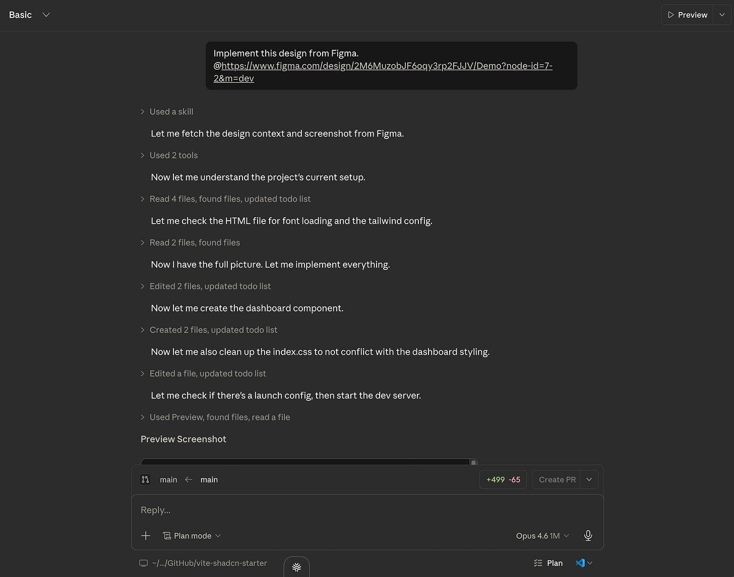 I start with an empty folder in Claude Code. I then go to Figma, select the frame I want to implement (in this case, a dashboard design), and copy the example prompt that appears in the MCP panel. It looks something like: “Implement this design from Figma.”