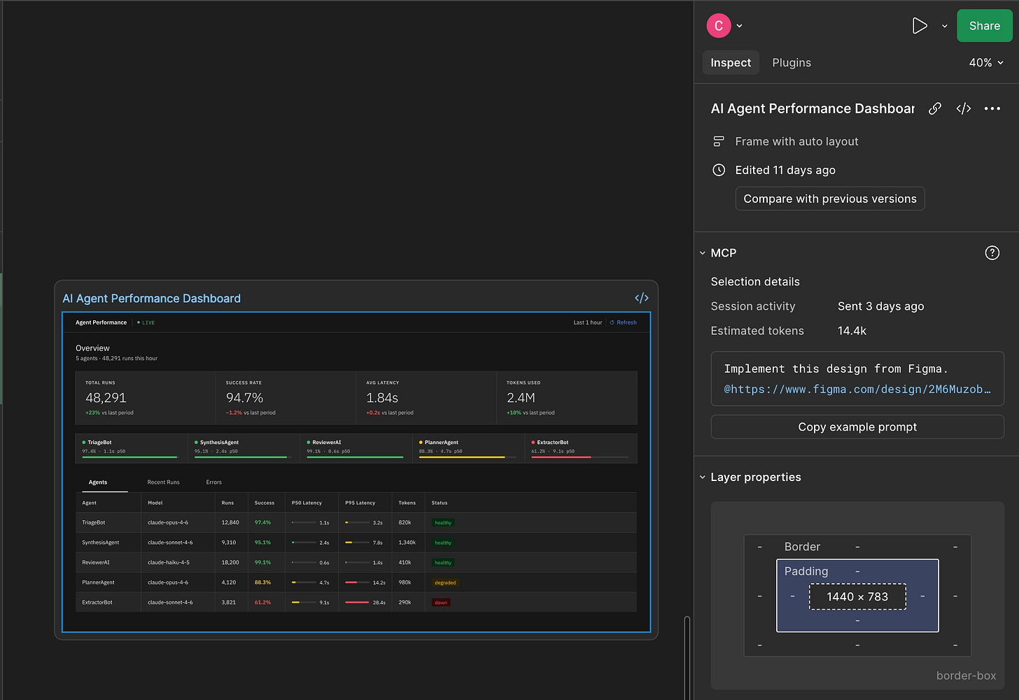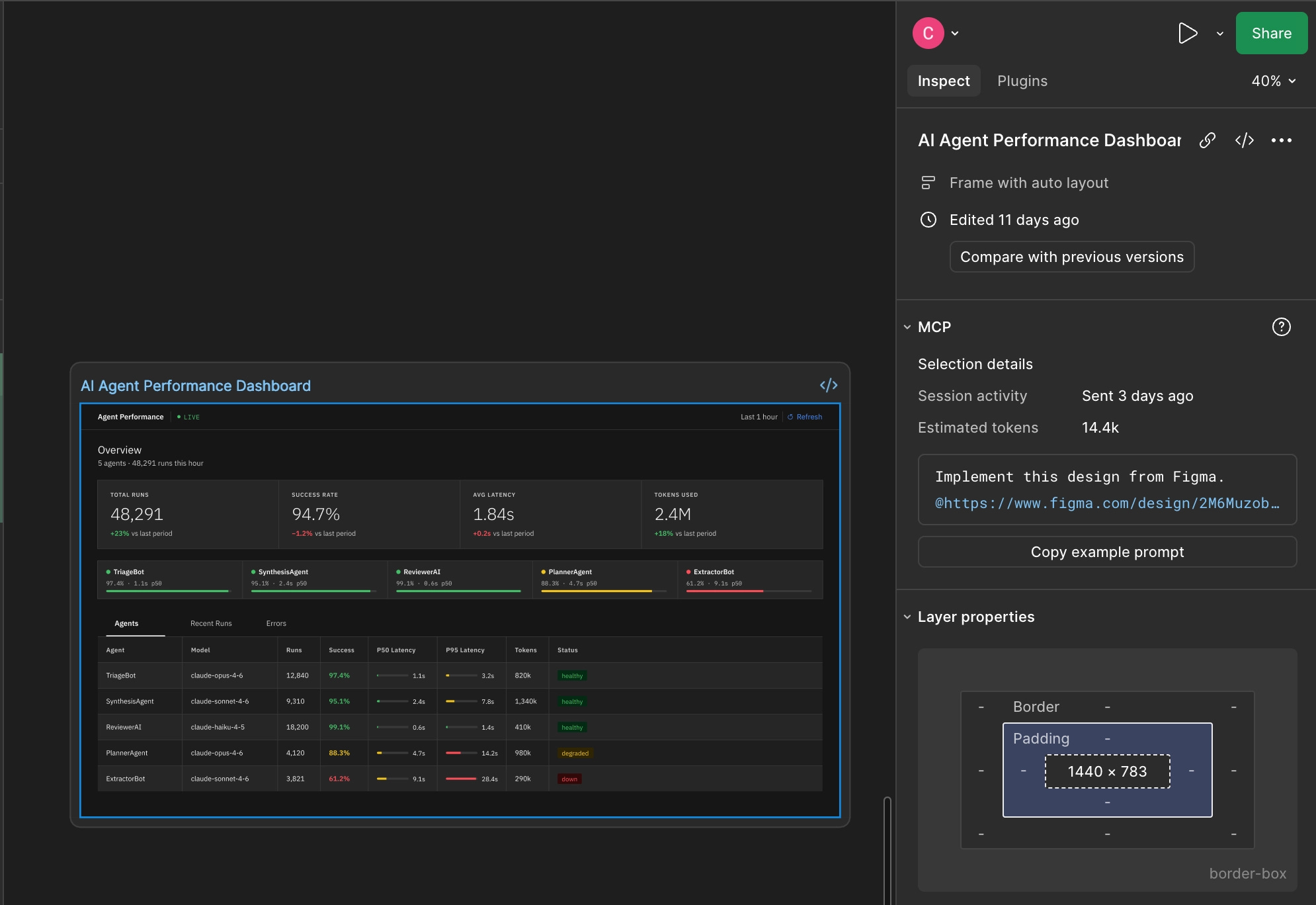 After a minute or so, the prototype is done. Comparing the original Figma mock to the implemented code, it’s 90 percent the same. The layout matches, the components look right, the data is in the right places. You’ll likely notice some differences, such as responsive layout gaps in the table or small changes in the components themselves.
