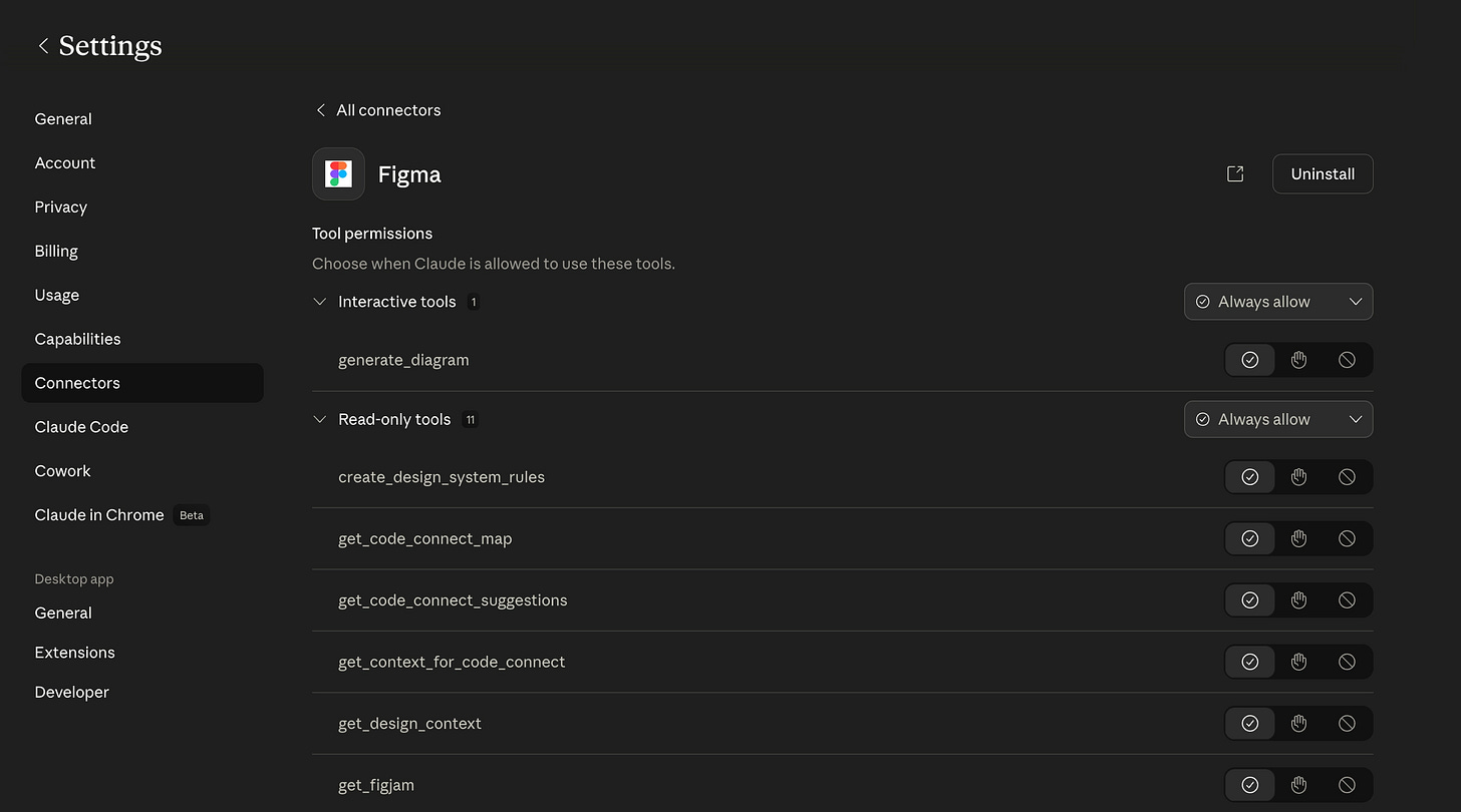 1) Figma: You need a full Figma seat with dev mode. In your design file, you’ll see an MCP option in the right panel when you enter dev mode. This tells Figma to make the design data available.
