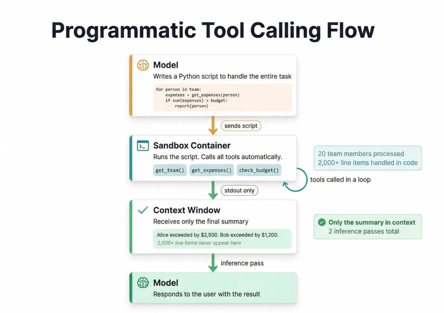 Anthropic released Programmatic Tool Calling in November 2025. The model writes Python that runs in a managed container. Your tools opt in by specifying allowed_callers: ["code_execution_20250825"] in their definition. The code runs inside the container, calls your tools as needed, and only the script’s output enters Claude’s context when it finishes.