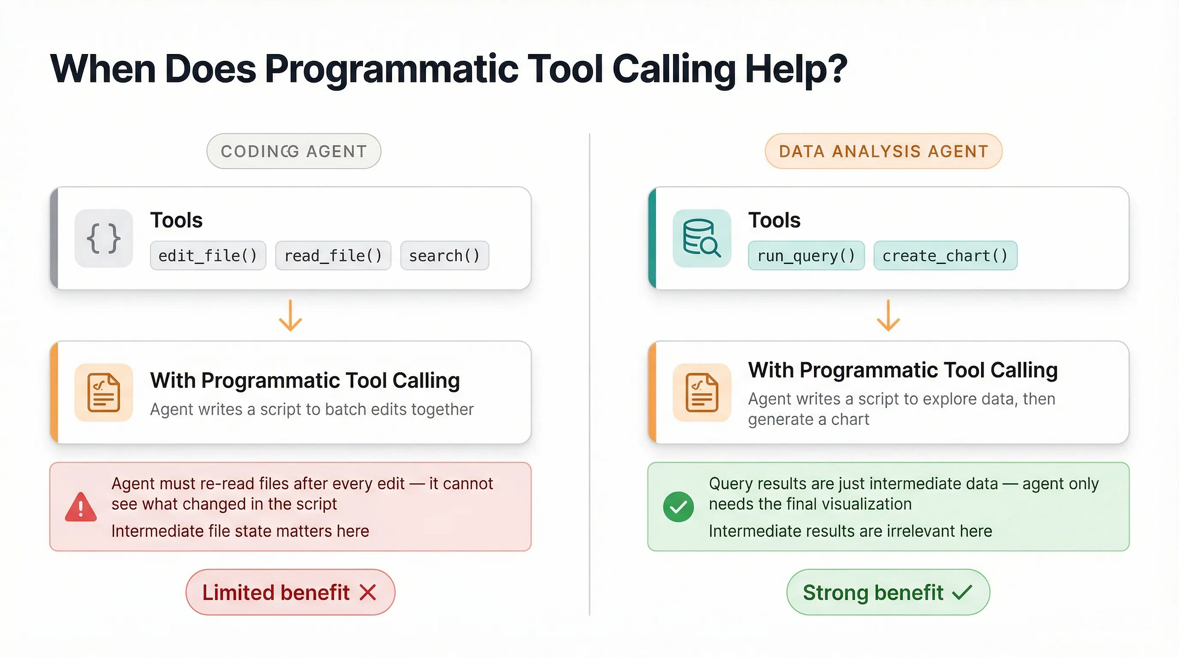 With a data analysis agent, we might have tools like run_query and create_chart. Based on the user’s question, the agent would run one or more queries and produce a visualization. Here programmatic tool calling would save a lot of time and tokens, as the intermediate query results themselves may not be important.