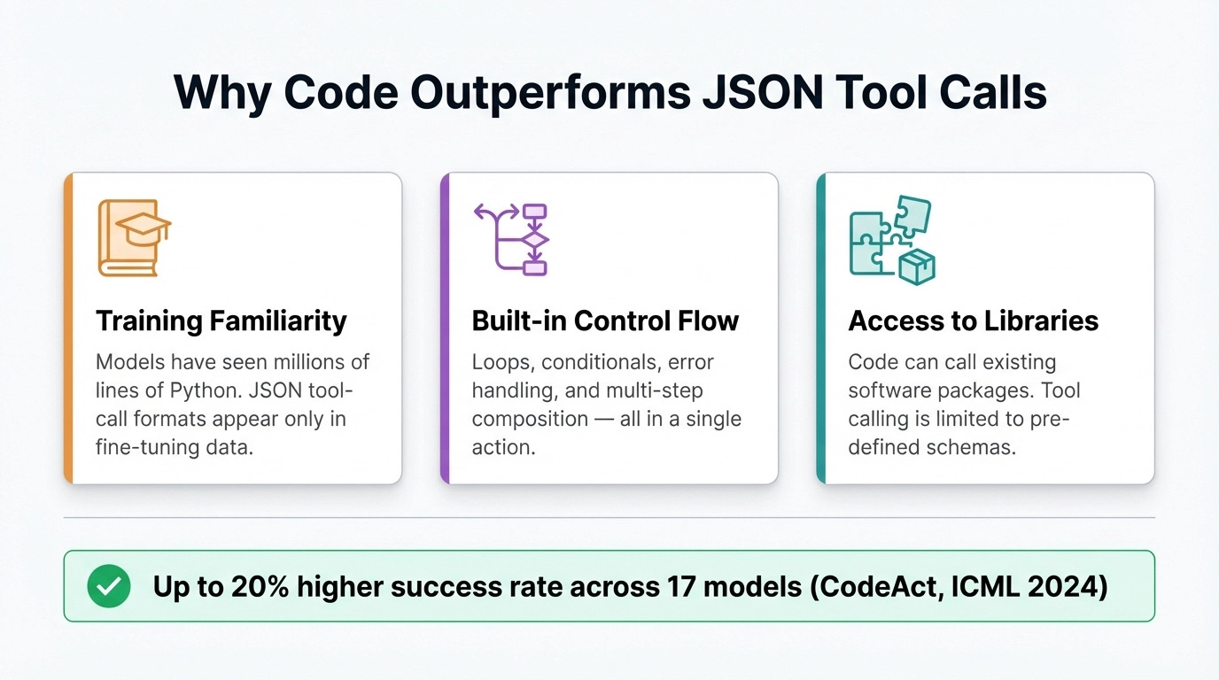 Code can call existing libraries rather than being limited to pre-defined tool schemas