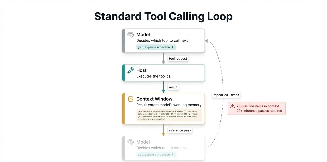 The model would start by calling get_team_members(), then calls get_expenses() for each person. It would then calculate each person’s budget one at a time, and finally return the list of people who exceeded the budget. All of this information has to sit in the context window, likely overwhelming the available memory and causing the agent to fail.